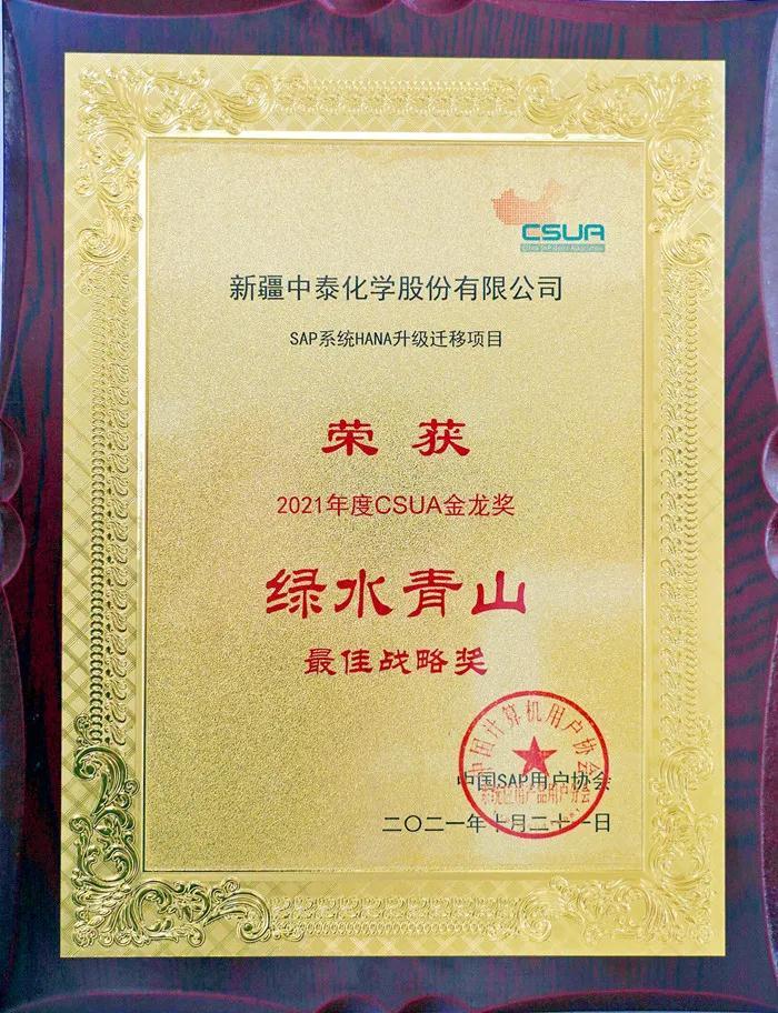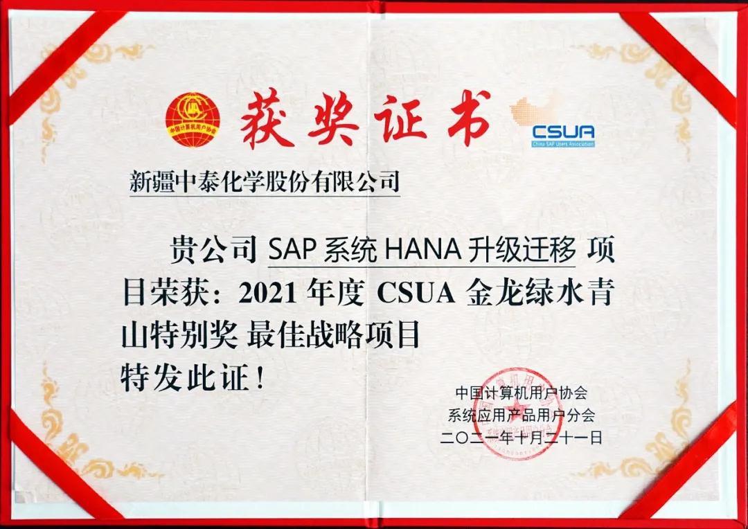 中泰化學(xué)SAP系統(tǒng)HANA升級(jí)遷移項(xiàng)目榮獲“CSUA金龍綠水青山特別獎(jiǎng) 最佳戰(zhàn)略項(xiàng)目”