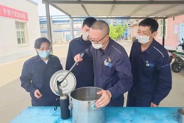 ? ?深入基層想員工所需,酷暑送清涼周到又貼心?!敖裉斓奈绮投嗔司G豆湯?!?中午13:30,結(jié)束一上午緊張的現(xiàn)場(chǎng)作業(yè),走進(jìn)員工休息區(qū),不少員工發(fā)現(xiàn)了這一貼心的“小變化”。制酸車間積極落實(shí)“我為員工群眾辦實(shí)事”“高溫酷暑送清涼”活動(dòng),深入生產(chǎn)一線高溫工作場(chǎng)所,開展多種形式的送清涼慰問活動(dòng),不少休息室裝有空調(diào),緩解暑熱。