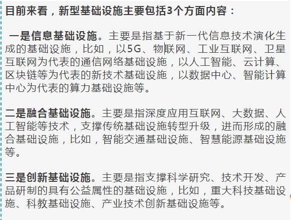 “新基建”近來引起輿論關(guān)注,但關(guān)于“新基建”的概念尚未明晰。4月20日,國(guó)家發(fā)改委作出權(quán)威解讀,目前來看,“新基建”包括信息基礎(chǔ)設(shè)施、融合基礎(chǔ)設(shè)施和創(chuàng)新基礎(chǔ)設(shè)施三方面。