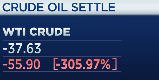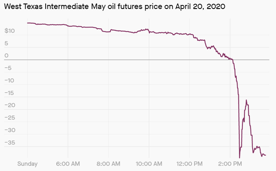 5月交貨的紐約輕質(zhì)原油期貨價(jià)格,幾乎是自由落體下降,一路跌破10美元、5美元、1美元、0美元,直到-37.63美元,終于停住了。
