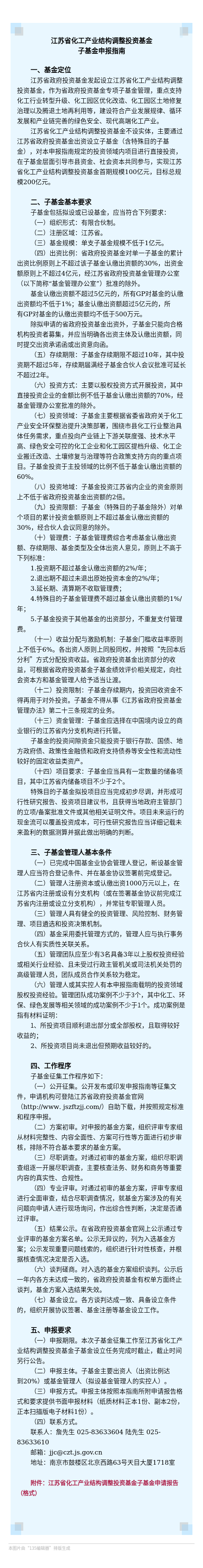 為助力化工產(chǎn)業(yè)結(jié)構(gòu)調(diào)整工作,江蘇省政府投資基金將設(shè)立一支專項子基金:江蘇省化工產(chǎn)業(yè)結(jié)構(gòu)調(diào)整投資基金。根據(jù)基金的設(shè)立方案制定的《江蘇省化工產(chǎn)業(yè)結(jié)構(gòu)調(diào)整投資基金子基金申報指南》4月30日正式向社會公布,子基金征集工作正式啟動。