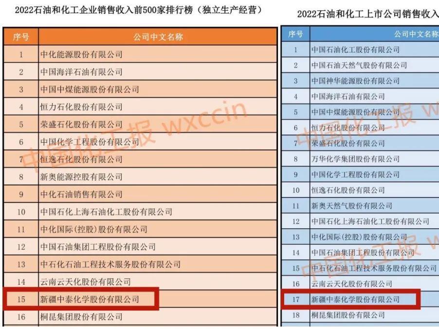 2022石油和化工企業(yè)銷售收入前500家發(fā)布 中泰化學(xué)位列獨(dú)立生產(chǎn)經(jīng)營企業(yè)第15位 上市公司第17位