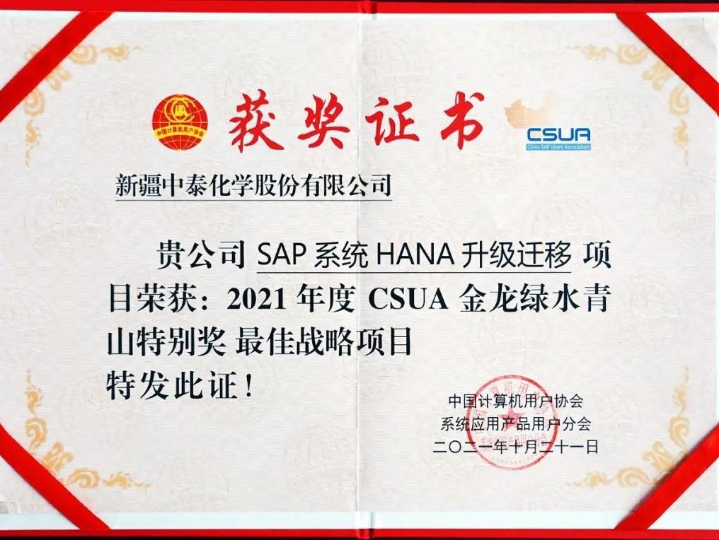 中泰化學(xué)SAP系統(tǒng)HANA升級(jí)遷移項(xiàng)目榮獲“CSUA金龍綠水青山特別獎(jiǎng) 最佳戰(zhàn)略項(xiàng)目”