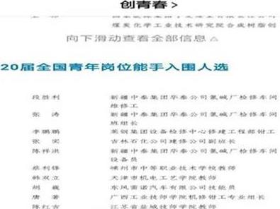近日,共青團(tuán)中央、人力資源社會保障部聯(lián)合發(fā)布了第20屆全國青年崗位能手(標(biāo)兵)、全國青年崗位能手入圍人選公示,華泰公司技術(shù)處專工段勝利、檢修車間班組長張濤、檢修車間設(shè)備員陳祥洪位列其中。獲獎(jiǎng)人員名單公示據(jù)了解,“全國青年崗位能手”是由共青團(tuán)中央、人力資源社會保障部共同組織開展的為黨育人、為國育才的重要品牌工程,旨在選樹在經(jīng)濟(jì)社會建設(shè)第一線、公共管理服務(wù)各領(lǐng)域、重大技能賽事比拼場服務(wù)人民、奉獻(xiàn)社會、