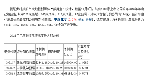 10月26日,證券時報發(fā)布報道稱,根據(jù)數(shù)據(jù)統(tǒng)計,截至10月26日,兩市已有560家公司公布2016年年度業(yè)績預(yù)告。中泰化學(xué)為預(yù)計年度業(yè)績增長率最高公司,2016年度歸屬于上市公司股東的凈利潤115000至125000萬元,按中值折算凈利潤同比達(dá)15532.33%。